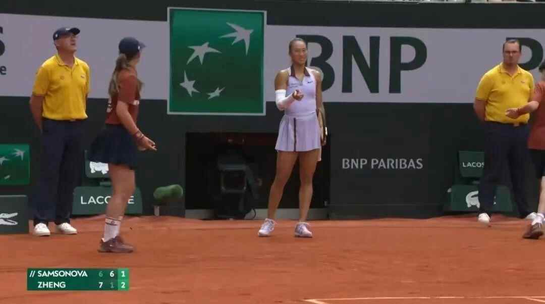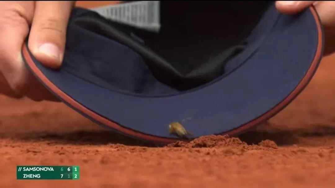 赛场上,发生了一些有趣的小插曲。比赛正在紧张进行中,一只小蜜蜂误入赛场。眼尖的郑钦文发现后,笑着请球童用温柔的方式请走小蜜蜂,球童于是用帽子将它捧起,并安全送出场地。