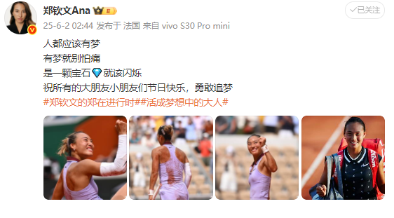 获得新突破后,郑钦文在社交媒体发文送上儿童节祝福:“人都应该有梦,有梦就别怕痛,是一颗宝石💎就该闪烁”,并鼓励大朋友小朋友“勇敢追梦”。
