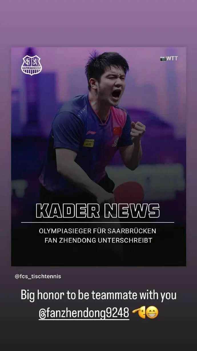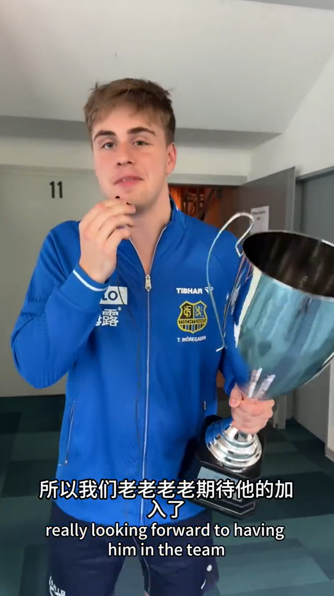 莫雷加德此前也在社交媒体上称,很荣幸成为樊振东队友。