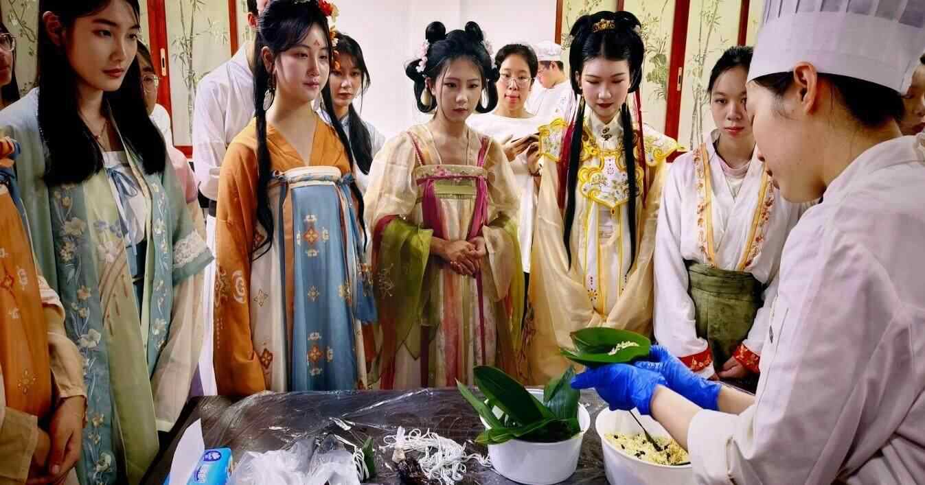 兰为君子之花,粽含家国之情,端午肯定少不了包粽子和吃粽子。“叶要叠成漏斗状,米要压实三分,绳需绕指三匝……”在游客服务中心,专业院校厨艺导师为大家开启“养生安康粽”手作体验,汉服爱好者与青年文艺家们围坐长案,以青叶裹玉,以巧手传情,将粤式粽香化作流动的文化诗篇。