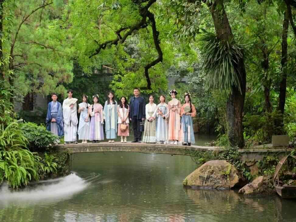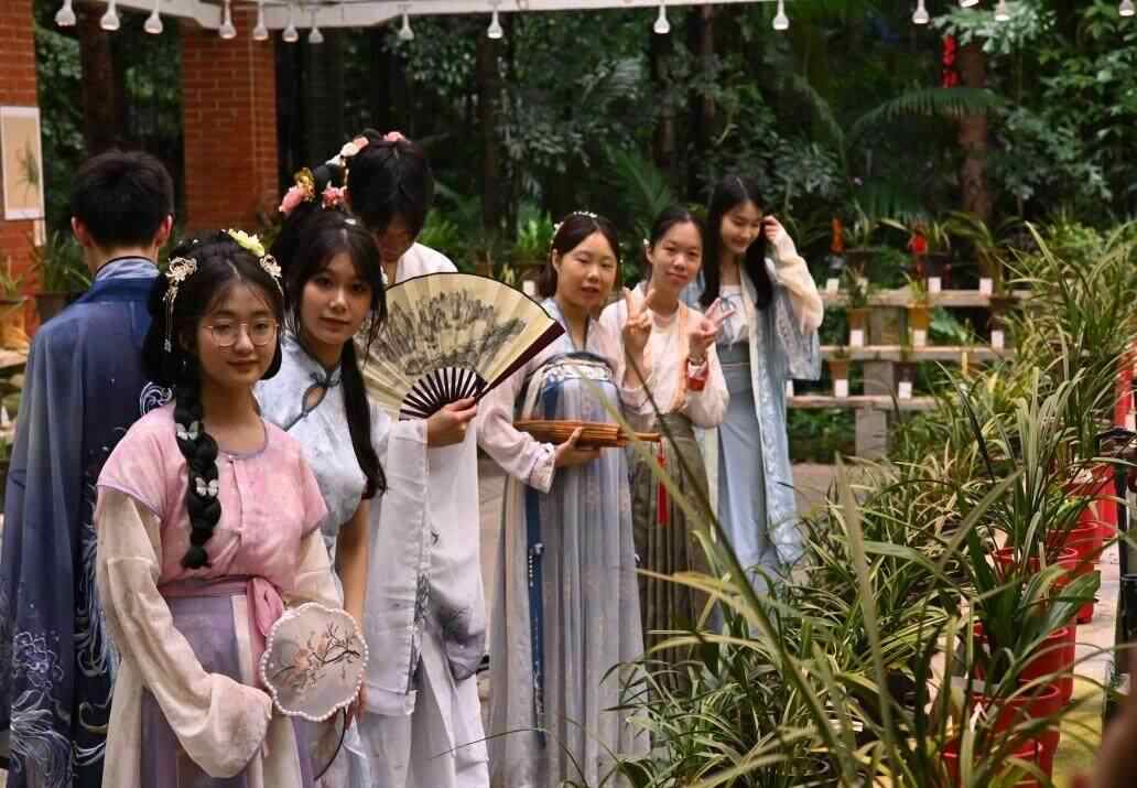 有时,漫步之意不在终点,而在于漫步本身。芳华园内,恍惚间宛若时光倒转,撑一把轻罗小伞,漫步在石拱桥上观水中“鱼戏莲叶间”,让天光挥洒在汉服上,倒映于澄澈的湖水中。循着意境从借云庄上拾级而下,邂逅珍稀兰科植物的绰约身姿,在明镜阁的玉桌旁感受“闲敲棋子落灯花”的婉约。油纸伞下,是岭南烟雨的遐想,团扇轻摇,是广府午后的舒适,这场游园满是温暖与感动。无需滤镜,随手按下快门,镜头定格的不只是华服盛景,更是传统文化与现代青春的绝美邂逅。