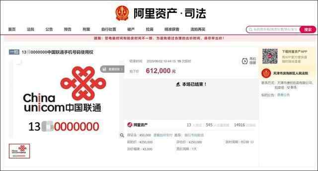 这个端午节,司法拍卖市场很火热。记者了解到,6月1日,“13**0000000”的手机号码使用权以25万元的底价起拍,吸引了13人报名参拍。在经历了激烈竞拍后,截至6月2日上午拍卖结束,该手机号最终拍出了61.2万元的高价。