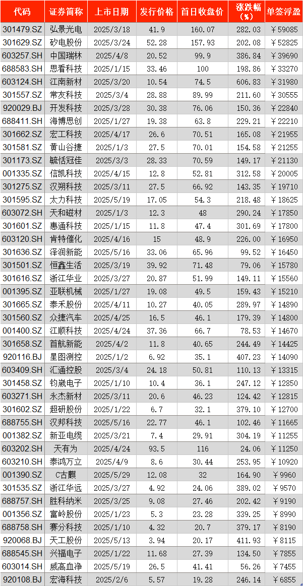 记者根据Wind数据统计,2025年1月至5月,共有43只新股上市,不仅实现零破发,还有33只新股的单签浮盈过万,占比高达77%。