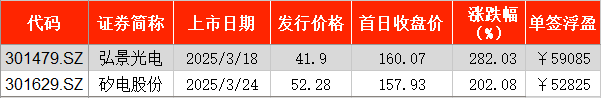 3月18日上市的弘景光电,发行价格超过了40元/股,首日收报160.07元/股,涨幅282.03%,单签浮盈达5.91万元。