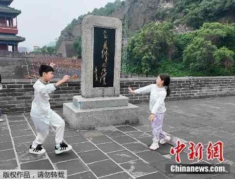 6月1日,来自新疆和田市的拜尔娜·阿卜力克木和阿卜杜海拜尔·阿拉合麦提在居庸关长城上跳舞。中新网记者 管娜 摄