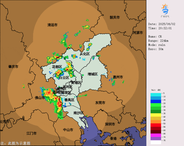 广州市气象台表示,受西南方向强雷雨云团移近影响,预计未来3小时广州市越秀区、天河区有强雷雨,累积雨量30-50毫米,小时雨强可达20-40毫米,并伴有8级左右阵风和强雷电。从6月2日20时50分起,广州市越秀区、天河区暴雨黄色和雷雨大风黄色预警信号生效,后期不排除升级预警信号,请市民做好防御。