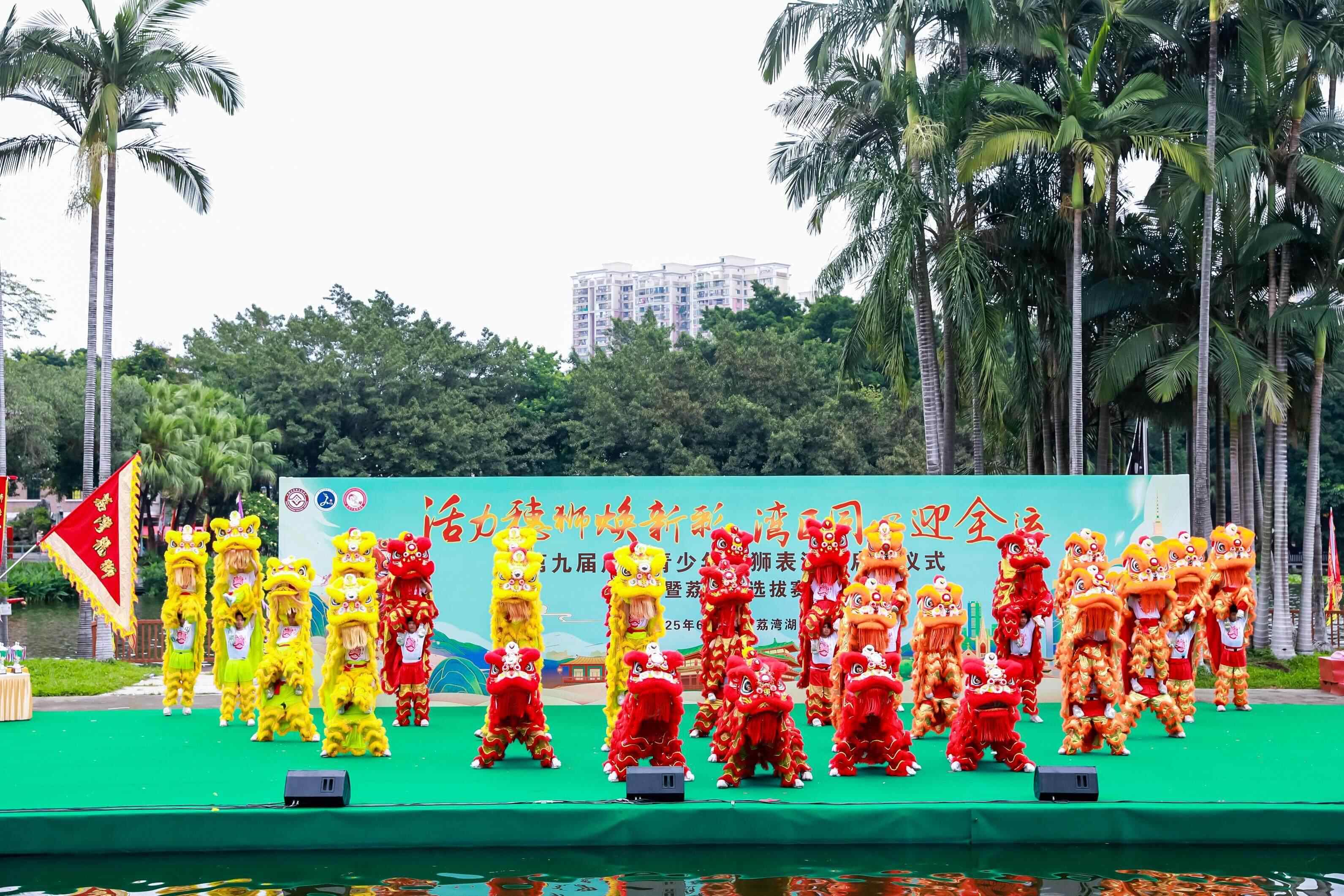 “第九届广州青少年醒狮表演赛启动仪式暨荔湾区选拔赛”在荔湾湖公园水上舞台举行,9支区内青少年醒狮精英队伍同台竞技,为观众带来狮舞盛宴。