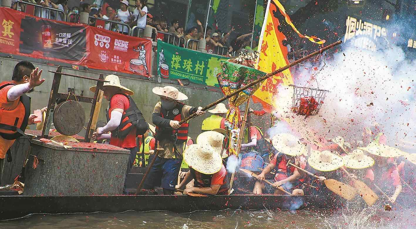珠江之上,一艘艘兄弟村的龙舟持柬赴约,“扒仔”们依循“三进三出”的传统龙船习俗礼仪,将代代相传的仪式 感展现得淋漓尽致,引得观众阵阵喝彩,欢呼声、掌声此起彼伏。