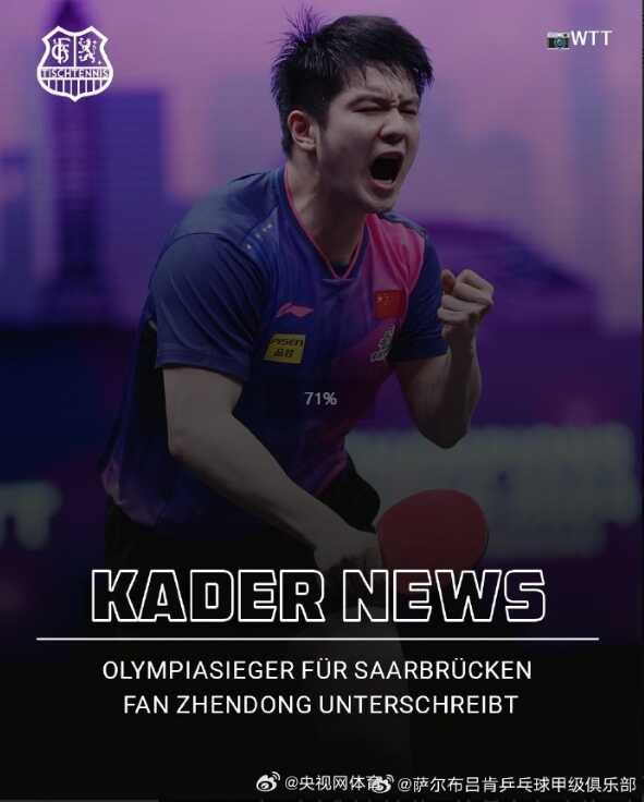 在俱乐部官方声明中,樊振东表示:我真的很期待在萨尔布吕肯和德甲的新挑战,体验新的环境——并与球队一起赢得更多的胜利。