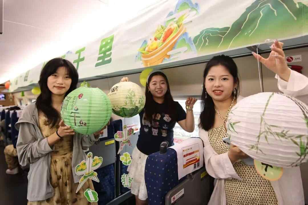 在厦门北开往北京南的G326次、福州南开往广州东的G3043次、福州开往南京南的G1672次列车上,粽子、香囊等挂件装饰在车厢各处,乘务员与旅客们一同参与包粽子、编五彩绳。从厦门北乘车前往南平市的吴平先生兴奋地表示:“我还是第一次在福建乘坐这种具有‘中国风’的主题列车。”