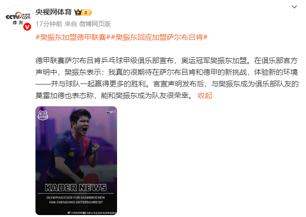 在俱乐部官方声明中,樊振东表示:我真的很期待在萨尔布吕肯和德甲的新挑战,体验新的环境——并与球队一起赢得更多的胜利。