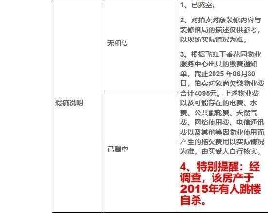 房子评估价222.79万元,但其起拍价仅125万元,相当于不到6折,这个打折幅度比普通法拍房要低,原因何在?答案就在法拍页面的房源说明里,其中有一条红色醒目告知——“特别提醒:经调查,该房产于2015年有人跳楼自杀。”也就是说,这套房子在很多人看来,属于“凶宅”。