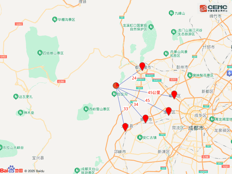 周边县城:震中距都江堰市24公里、距大邑县33公里、距崇州市34公里、距温江区45公里、距郫都区45公里,距成都市65公里。