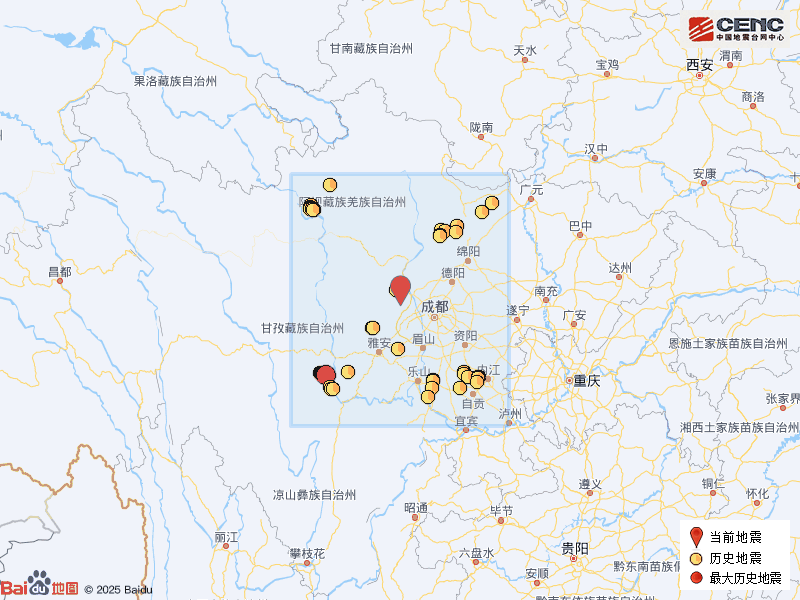 历史地震:根据中国地震台网速报目录,震中周边200公里内近5年来发生3级以上地震共193次,最大地震是2022年9月5日在四川甘孜州泸定县发生的6.8级地震(距离本次震中193公里),按震级大小前50次历史地震分布如图。