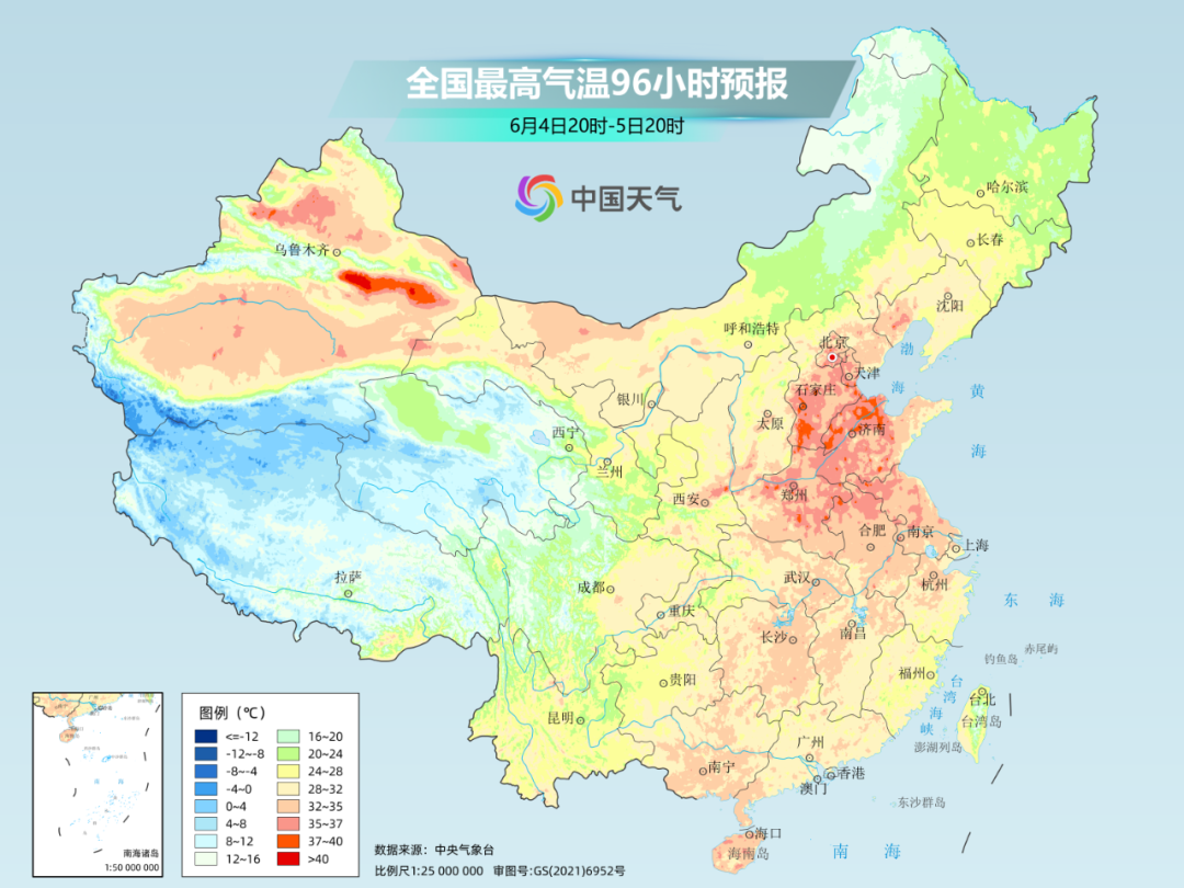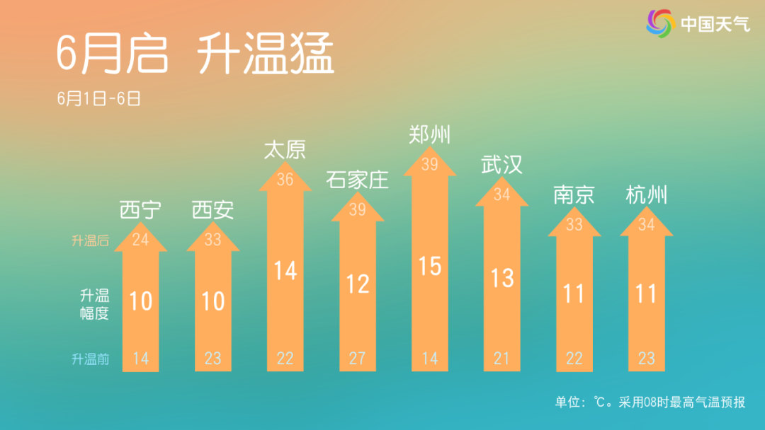 重点关注5日开始的高温过程:预计,华北南部、黄淮西部和北部、陕西关中、四川盆地等地气温持续升高,上述地区最高气温将有35~38℃。尤其是河北、河南、山东等地将出现较大范围高温天气,部分地区最高气温将超过38℃。