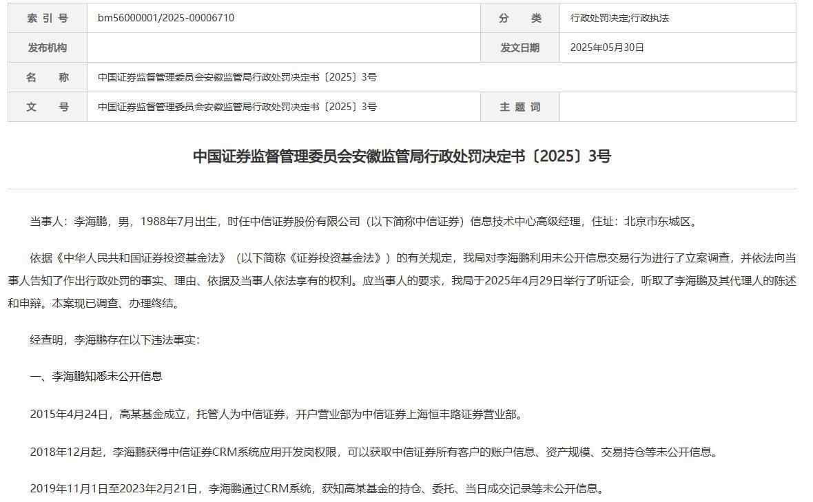 据安徽证监局查明,2015年4月24日,高某基金成立,托管人为中信证券,开户营业部为中信证券上海恒丰路证券营业部。2018年12月起,李海鹏获得中信证券CRM系统应用开发岗权限,可以获取中信证券所有客户的账户信息、资产规模、交易持仓等未公开信息。