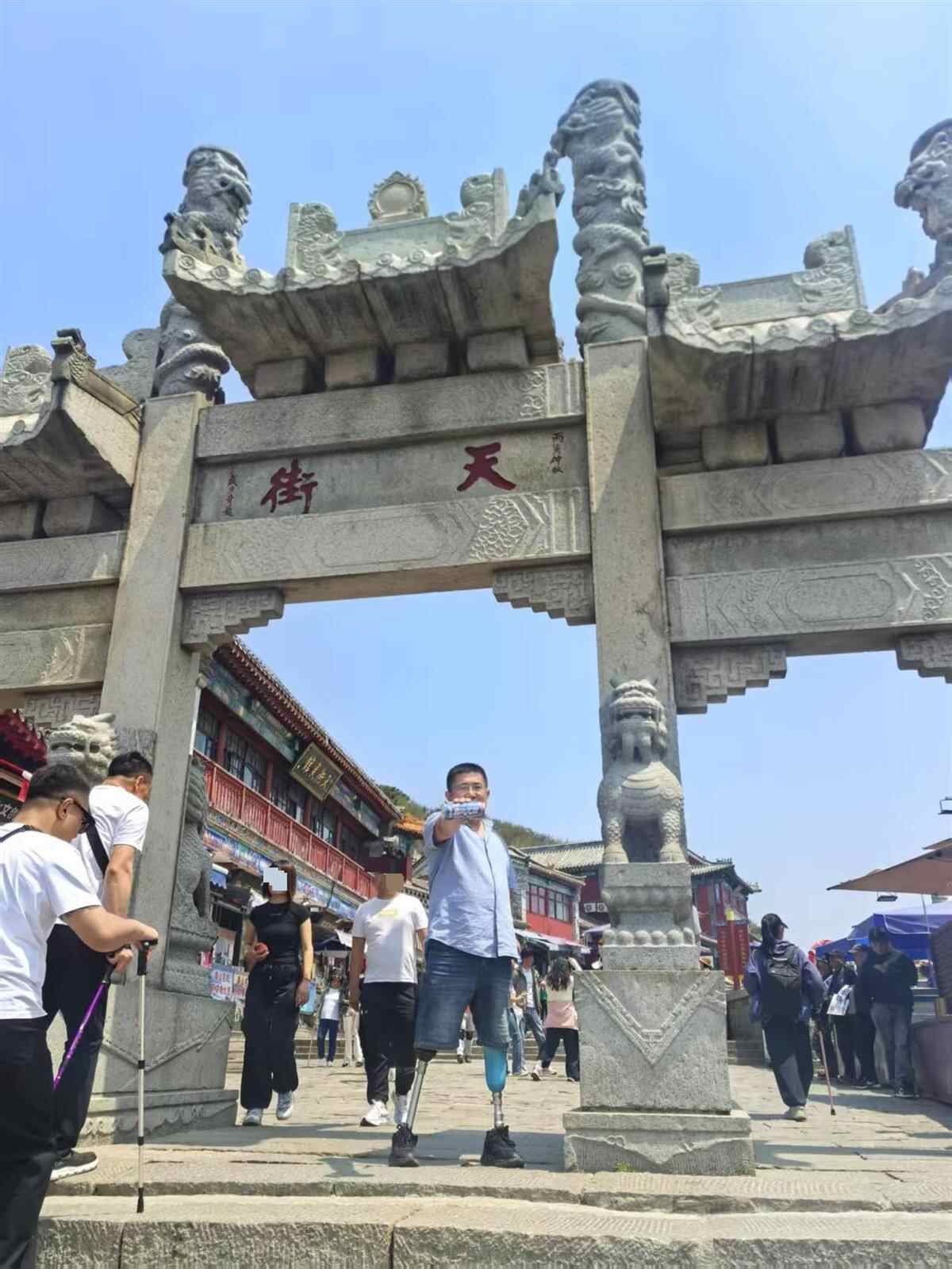 出生于1985年的盛先生,是山东淄博人。15岁那年,他不幸遭遇交通事故,给双腿带去永久的伤残:左腿膝盖以下截肢,右腿在膝盖处截肢。他说,由于自己穿假肢,选择了假肢矫形行业的工作,至今有10余年时间。工作中,他接触到一些朋友,心理上迈不过那道坎。2023年,他和5名残疾人朋友相约,前往山东潍坊的仰天山游玩,在那次活动后,他感受到,大家的自信心增强了。“爬山和徒步,既是激励自己,也是激励身边人,跨越心理障碍,把自己当成正常人看待。”盛先生说。
