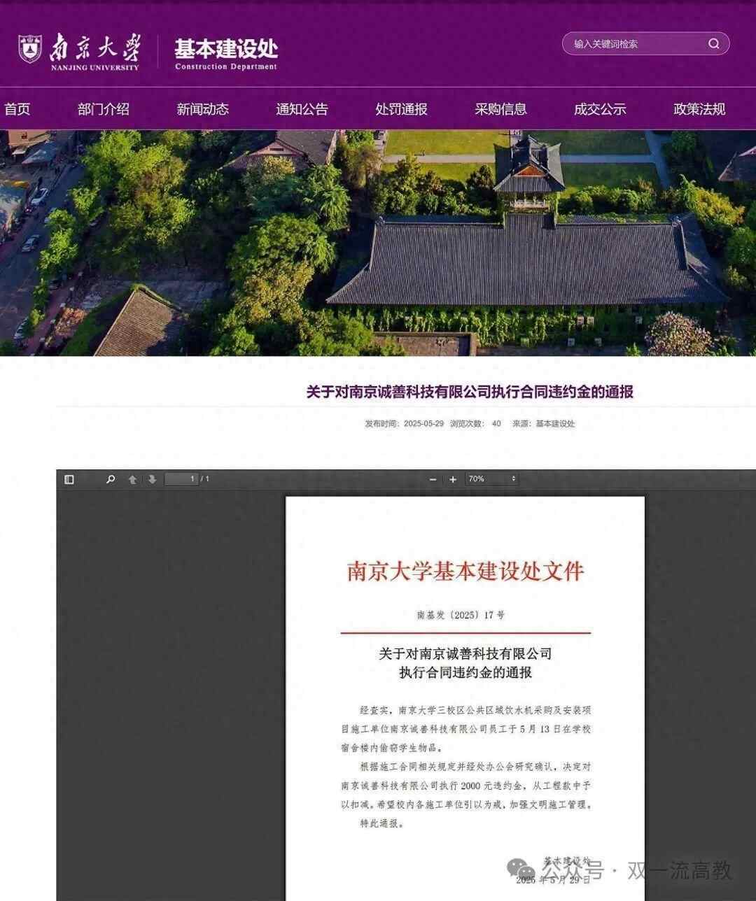 5月29日,南京大学基本建设处发布《关于对南京诚善科技有限公司执行合同违约金的通报》。
