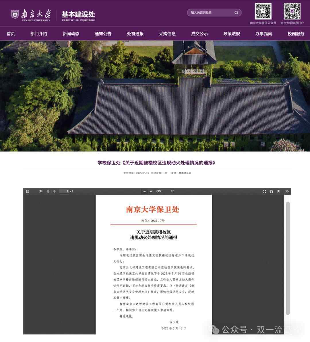 近期(5月16日),南京大学基本建设处网站还发布了《学校保卫处〈关于近期鼓楼校区违规动火处理情况的通报〉》——