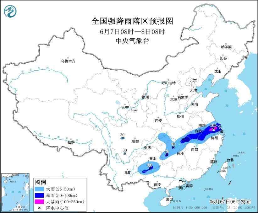 预计,6月7日08时至8日08时,湖北东部和南部、安徽中南部、江苏南部、上海、湖南西部和北部、江西北部、浙江西部和北部、贵州东部和南部、广西西北部等地部分地区有大到暴雨,其中,江苏南部等地局地有大暴雨(100~150毫米)。上述部分地区伴有短时强降水(最大小时降雨量30~60毫米,局地可超过80毫米),局地有雷暴大风等强对流天气。