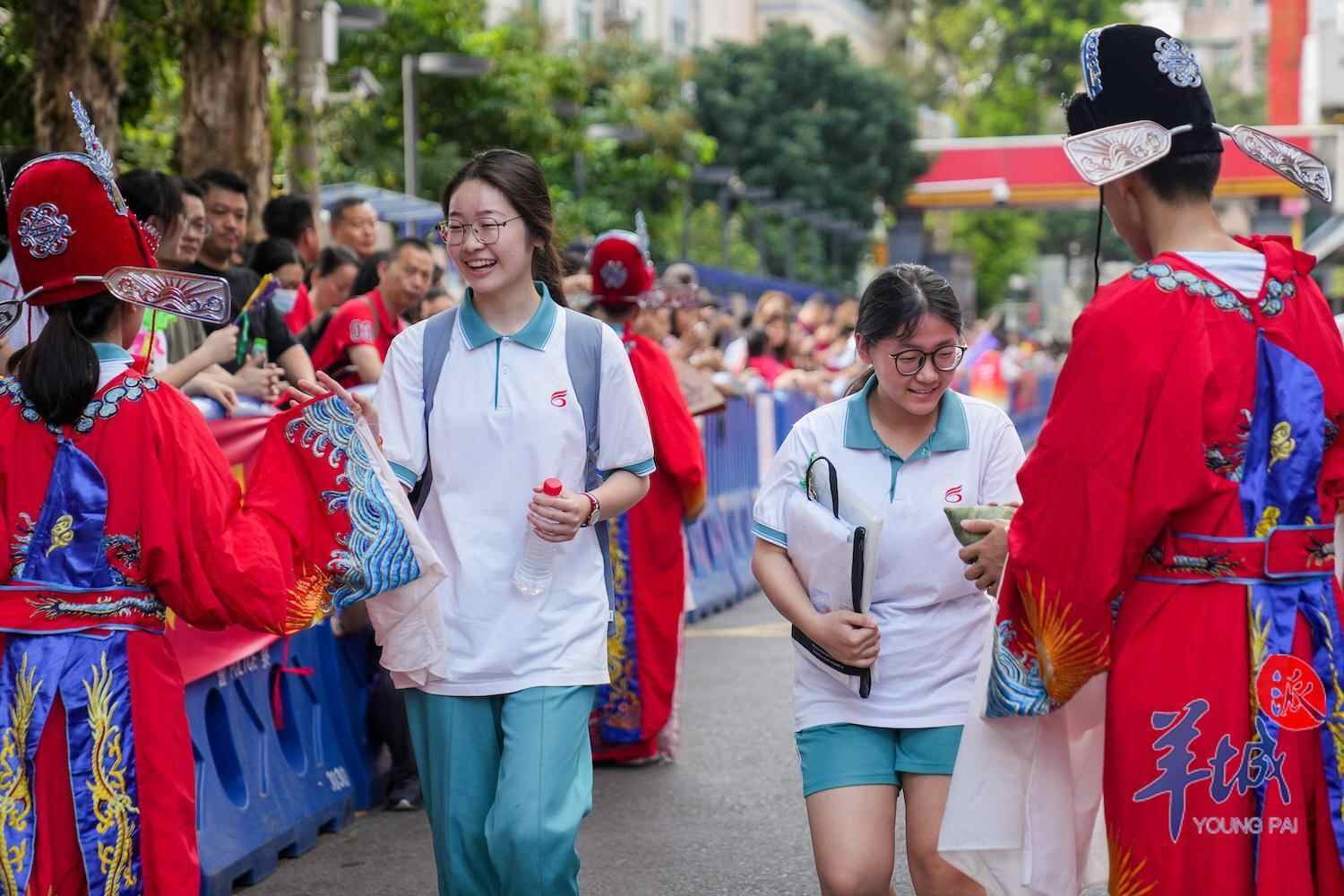 在广州市第六中学(海珠校区)考点,几位学弟学妹穿上戏服扮演文曲星,在进校通道与考生击掌加油,祝福考生一举夺魁。
