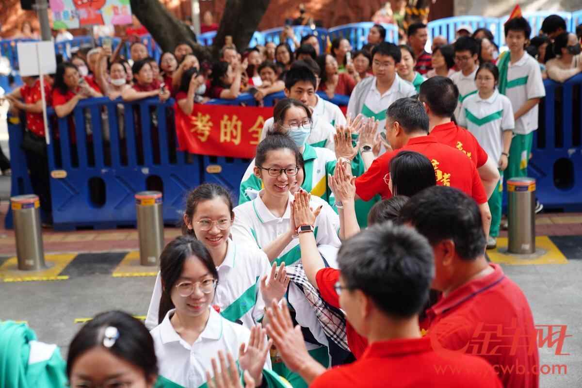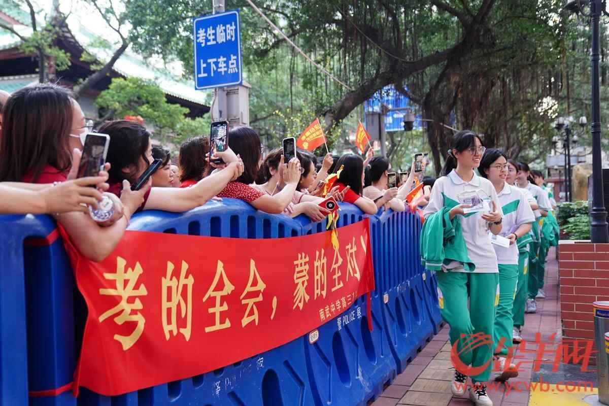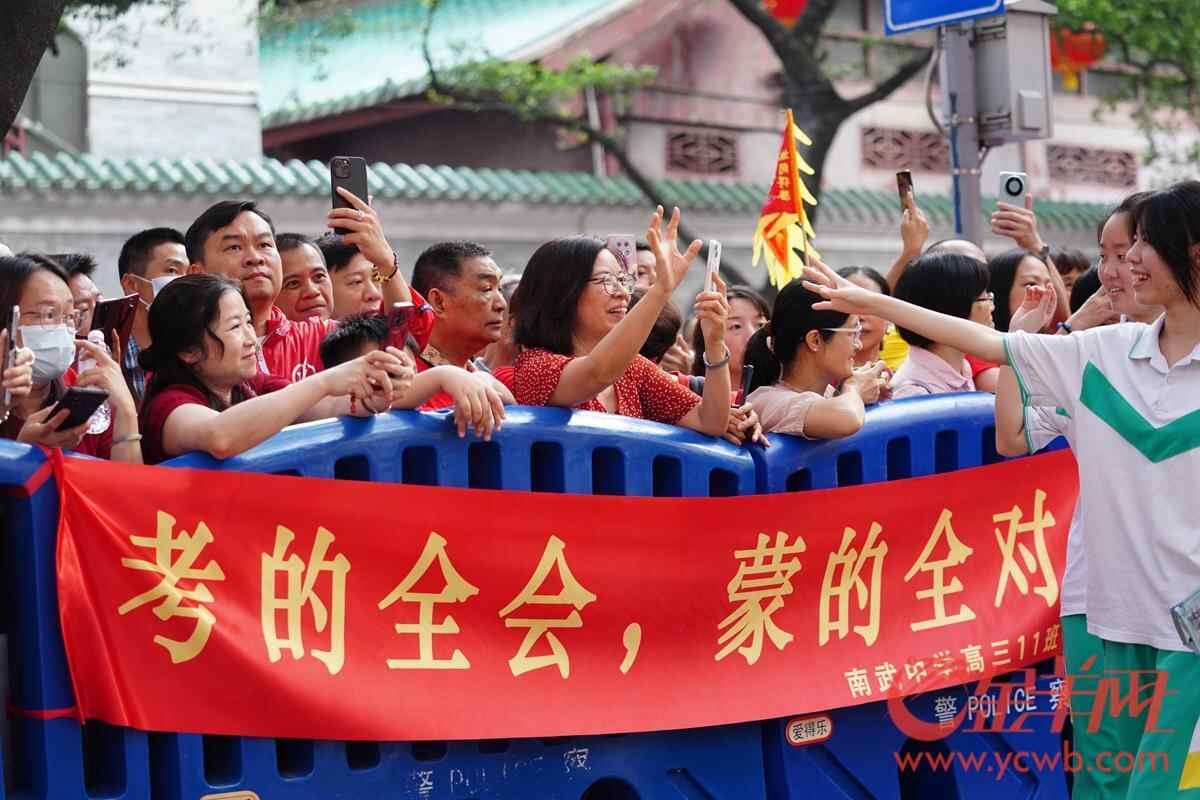 高考首日广州南武中学考点 老师家长花式助威