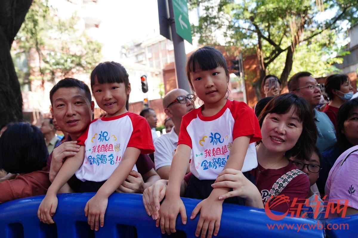 2025年6月7日,高考第一天,广州南武中学考点外,一对双胞胎穿着统一的衣服为姐姐加油。 羊城晚报全媒体记者 宋金峪 摄