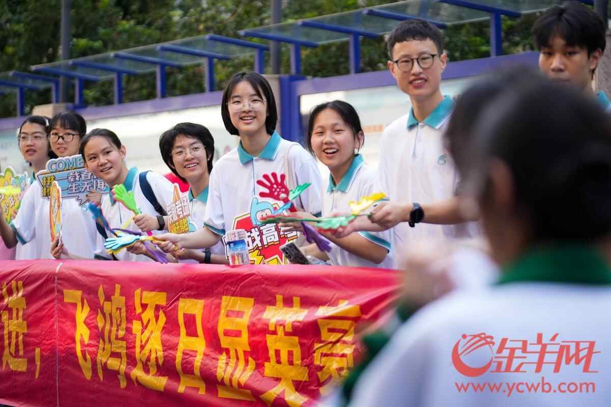 6月7日,在广州市第六中学(海珠校区)考点,学弟学妹们在进校通道为考生们加油鼓励。