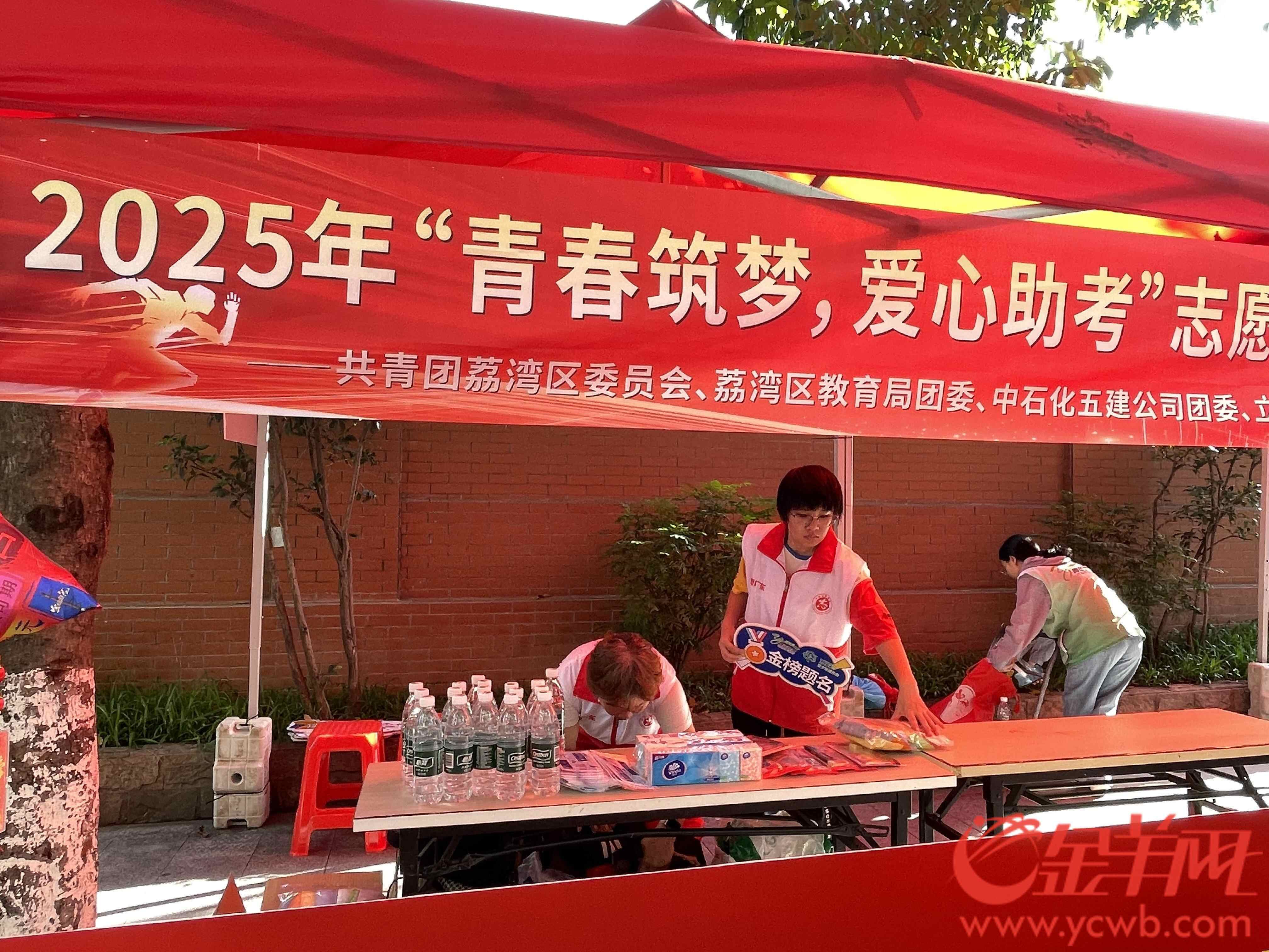 在广州地铁陈家祠站靠近广州市第四中学的考点出口,设置了爱心助考驿站。摊位有药品、雨衣、雨鞋、文具、雨伞等,免费供考生使用。