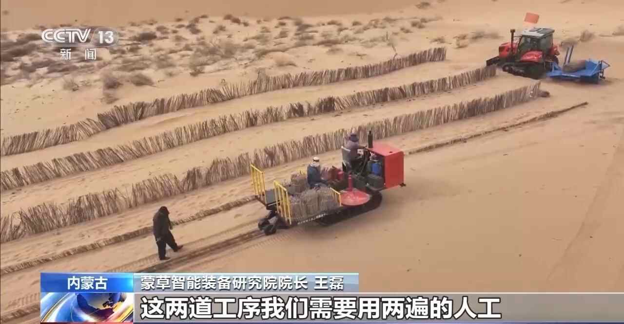 蒙草智能装备研究院院长 王磊:过去沙障、播种这两道工序需要用两遍的人工,多钻头灌木打孔机的效率在人工的二三十倍以上。