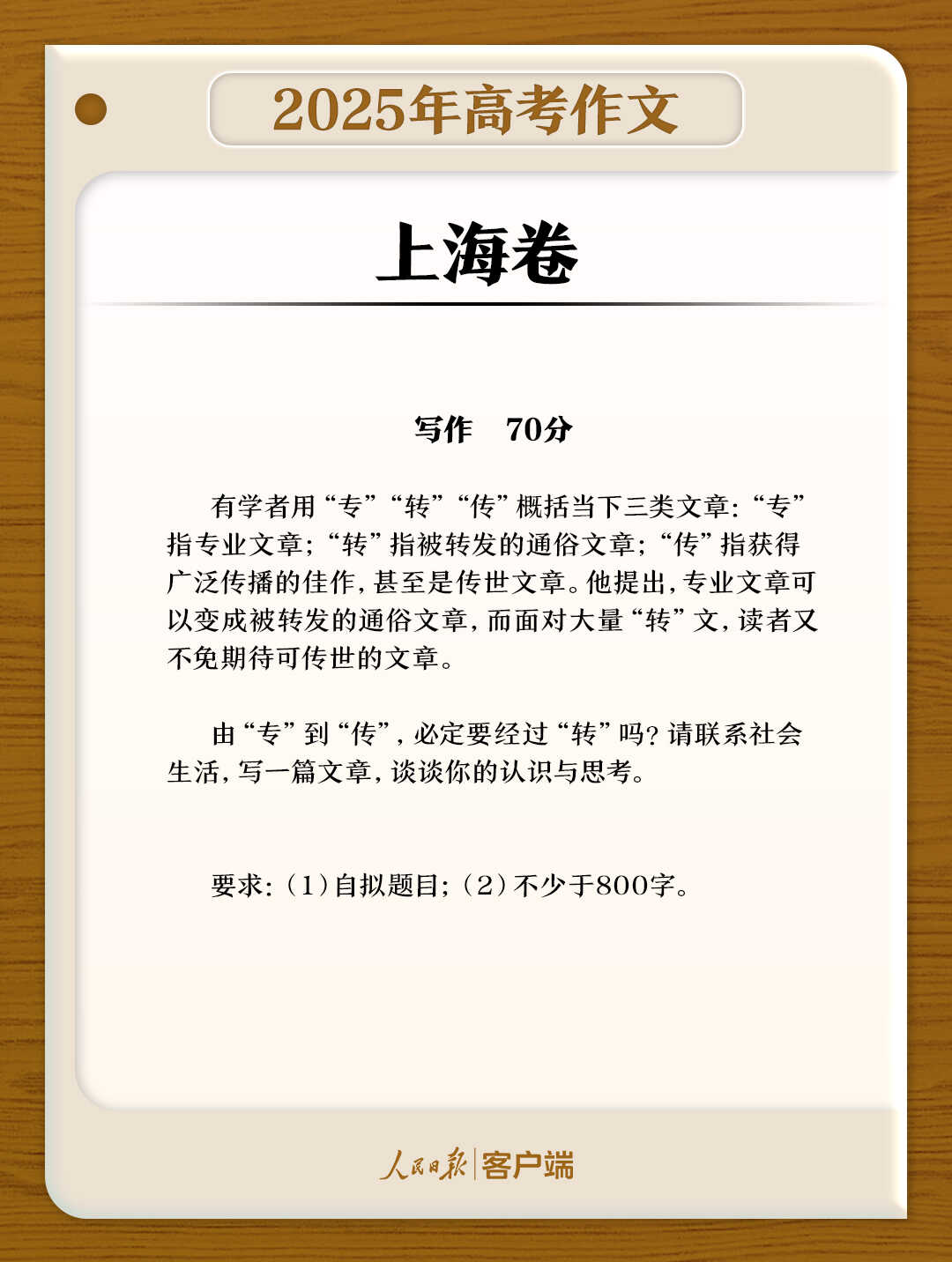 6月7日上午11:30,2025年全国高考的首场语文考试结束。今年上海的高考作文题由“专”“转”“传”三个字而来,提及有学者用“专”“转”“传”概括三类文章,让不少网友直呼很难。