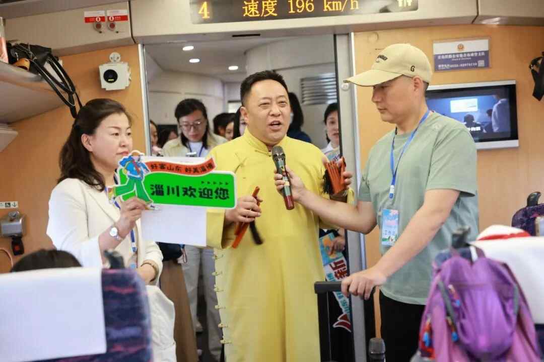 淄博非遗传承人在“烧烤专列”上向旅客展示山东快书。