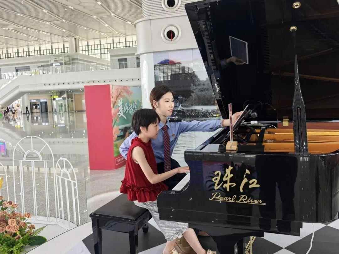在人来人往的车站内,一位小旅客正与工作人员在音乐驿站合奏钢琴曲。