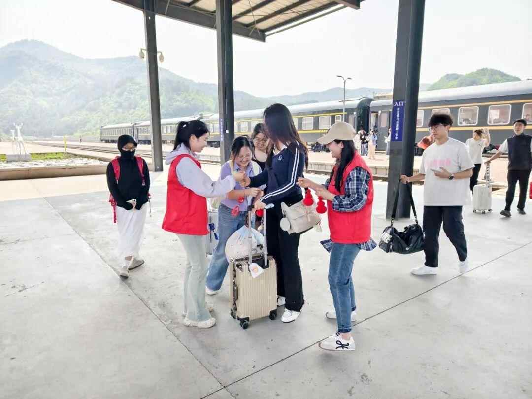 文明实践志愿者为乘坐6273次公益“慢火车”的旅客和返乡游子送上七彩纸葫芦,祝福他们端午安康、幸福绵长。