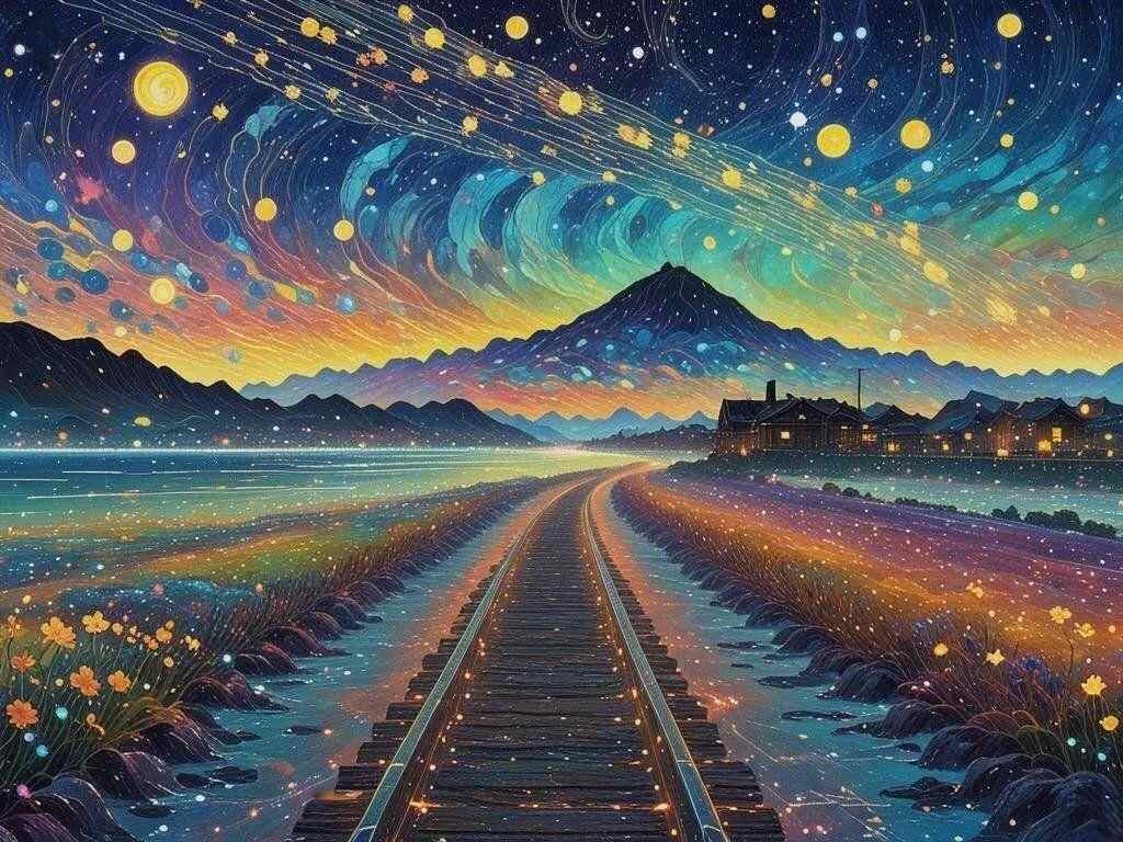 身为一名列车司机,我于今年一次夜班值乘时,透过车窗邂逅了满天繁星,心有所动便将其记录下来。在灵感迸发之际,联想到莫奈笔下的梦幻世界,我将AI技术与现实景象融合,由此创作出一幅美轮美奂、如梦如幻的图片。