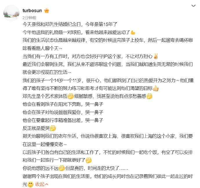 6月7日,孙俪在社交平台发长文称,今天是自己和邓超第15周年结婚纪念日。