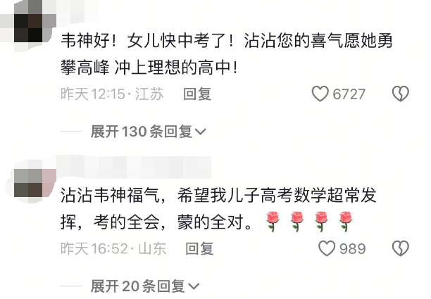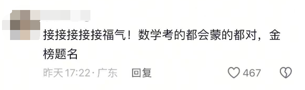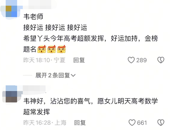 韦东奕开设账号第二天正值全国高考首日,其首条视频评论区也成为“高考许愿池”。不少考生及考生家长涌入评论区许愿,“考的都会”。