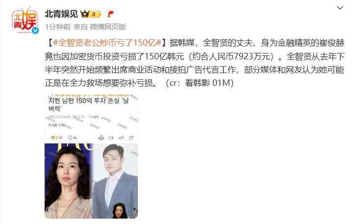 6月7日,话题“韩媒曝全智贤老公炒币亏150亿韩元”冲上热搜。