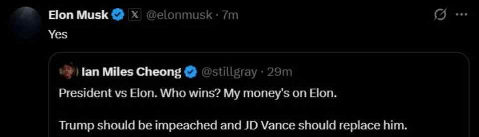 马斯克当天在社交媒体平台“X”上一则有关支持弹劾特朗普的帖文中回复“是的”。