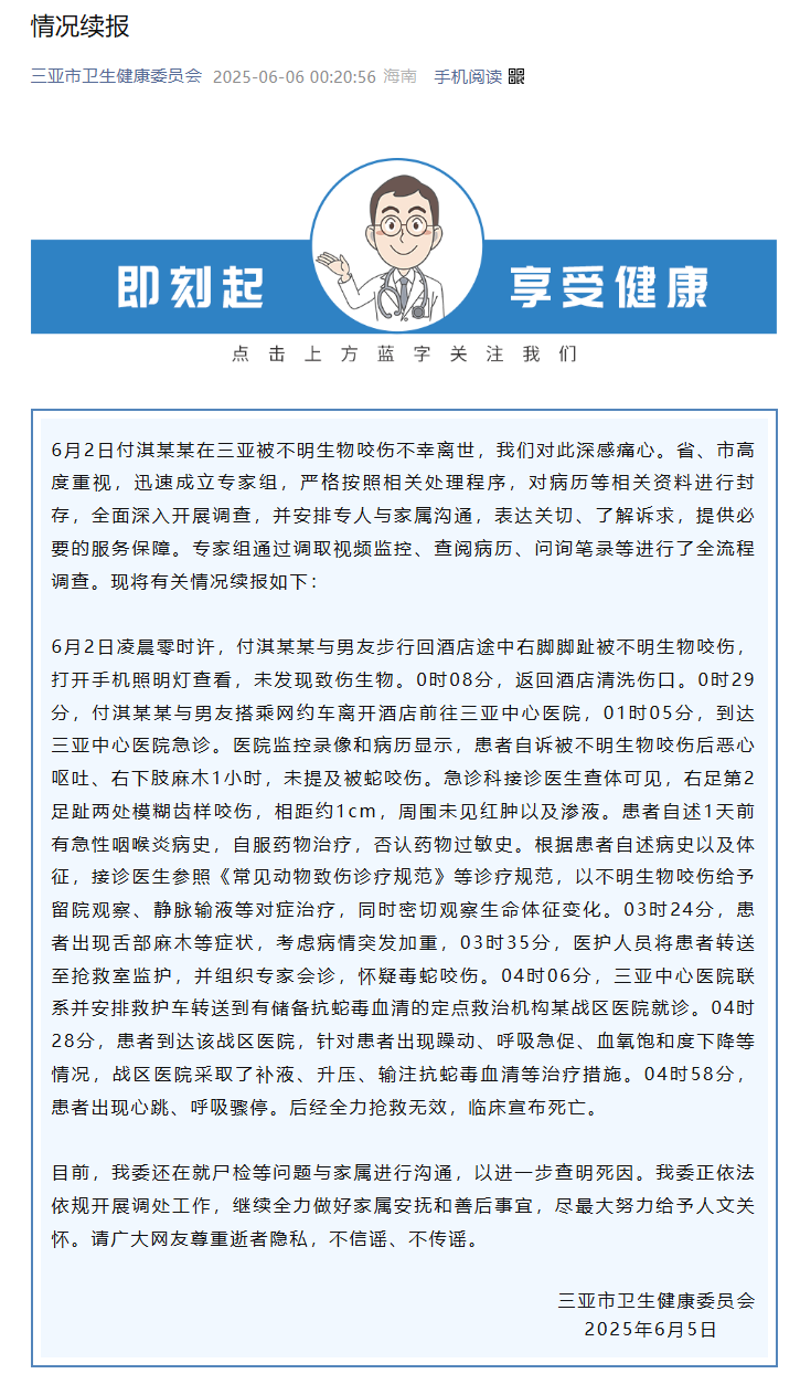 6月2日付淇某某在三亚被不明生物咬伤不幸离世,我们对此深感痛心。省、市高度重视,迅速成立专家组,严格按照相关处理程序,对病历等相关资料进行封存,全面深入开展调查,并安排专人与家属沟通,表达关切、了解诉求,提供必要的服务保障。专家组通过调取视频监控、查阅病历、问询笔录等进行了全流程调查。现将有关情况续报如下: