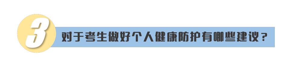 考生要做好个人防护,当好自身健康第一责任人。考前尽量减少聚集和流动,不去人员密集场所。同时,调整好心理状态,保证合理的饮食、充足的睡眠、适当的身体锻炼,如有不适,要及时就医治疗,谨防因身体不适而影响考试。对于发热或者突发急病等考生,也不必担心恐慌,各地考点都制定了相应的预案。