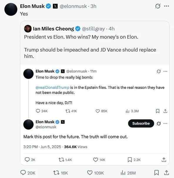 对另一位用户的帖子“总统 vs. 埃隆(马斯克),谁会赢?我赌埃隆赢。特朗普应该被弹劾,(副总统)万斯应该取代他。”,马斯克回复“是的”。