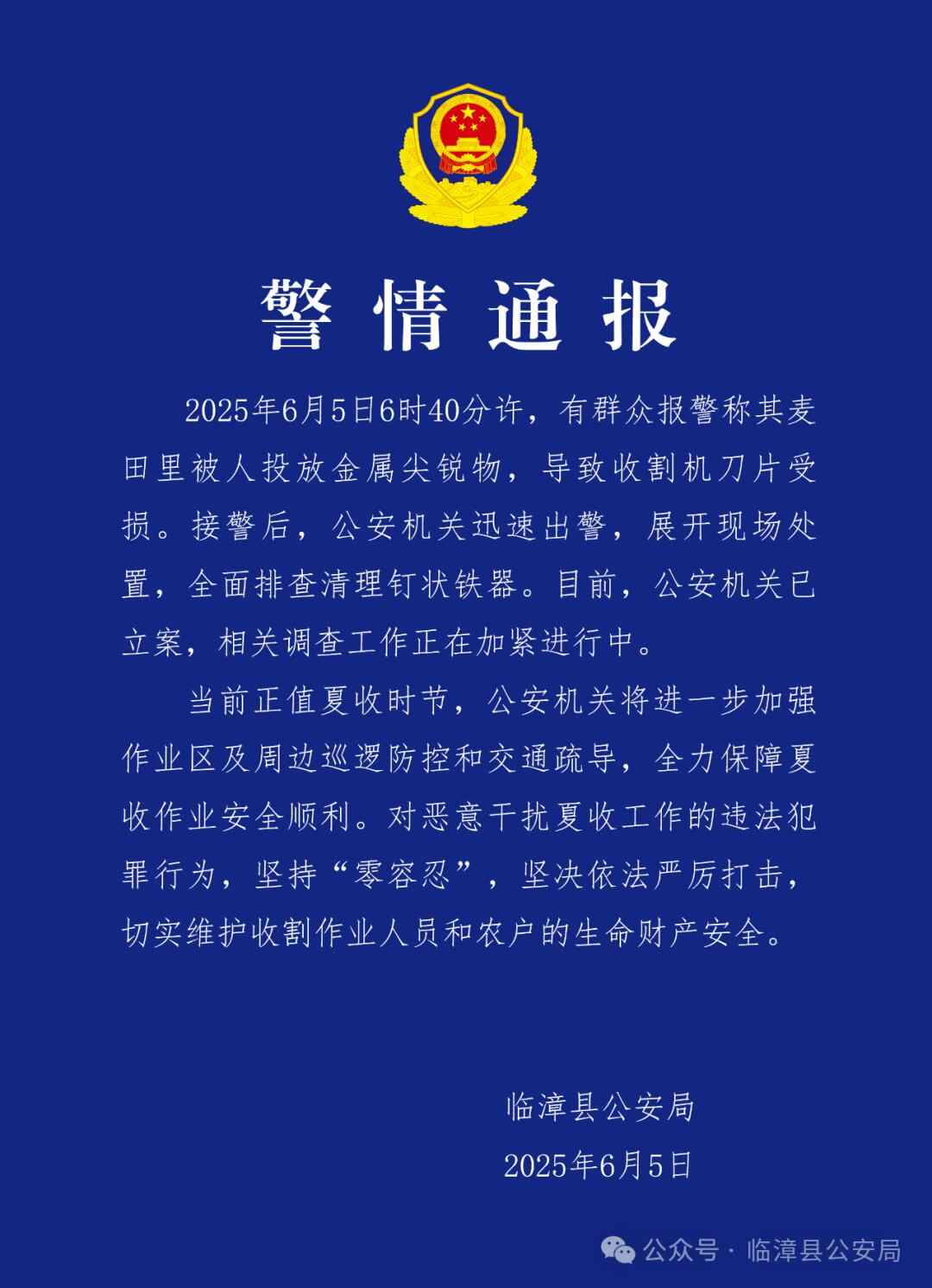 2025年6月5日6时40分许,有群众报警称其麦田里被人投放金属尖锐物,导致收割机刀片受损。接警后,公安机关迅速出警,展开现场处置,全面排查清理钉状铁器。目前,公安机关已立案,相关调查工作正在加紧进行中。