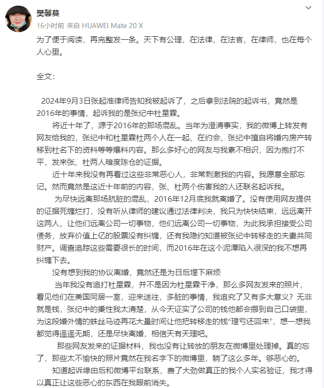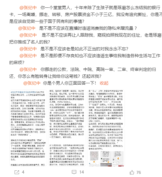 6月5日,导演张纪中前妻樊馨蔓发长文,回应近期被张纪中夫妇反诉一事,并公开喊话张纪中正面回应多项指控,樊馨蔓称张纪中“一场离婚,挪走、转移、房产股票资金不少于三亿”。