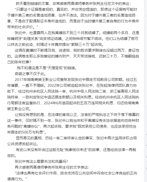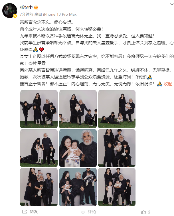 张纪中称:“某所言念念不忘,痴心妄想。两个成年人决定的协议离婚,何来转移必要!九年来被不断以各种手段迫害无休无止,我一直隐忍承受,但人要知趣!我前半生虽有婚姻却无幸福。自与我的夫人星霖携手,才真正体会到家之温暖。心怀感恩。某女士企图以任何方式破坏我现有之家庭,绝不能容忍!我将倾尽一切守护我们的家!另外某人所言皆属造谣污蔑,懒得解释,离婚已九年之久,纠缠不休,无聊至极。抱歉一次次被某人逼迫把私事拿到公众浪费资源,还望海涵!谣言止于智者!邪不压正!内心坦荡,无亏无欠,无愧无憾!依旧祝福!”