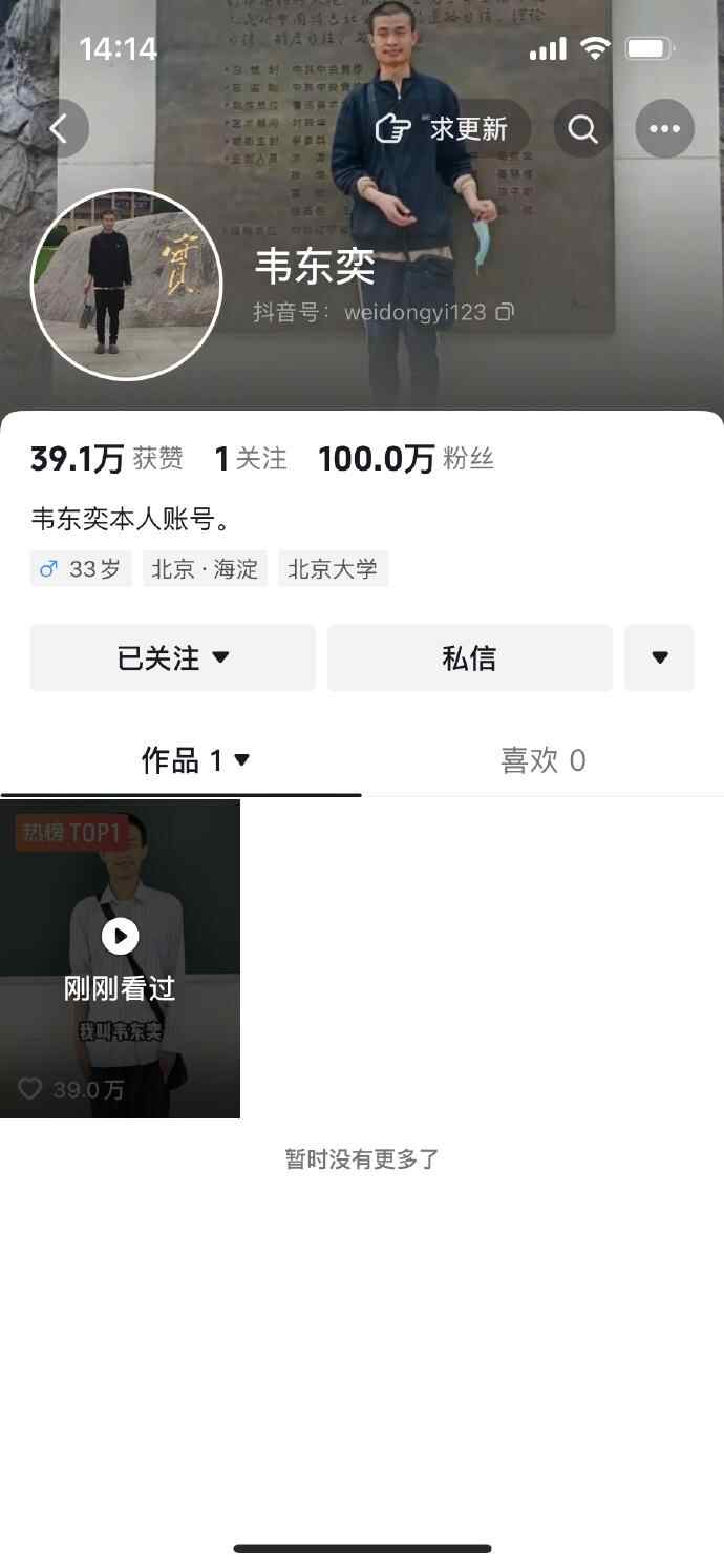6月6日,有网友在短视频平台发现一账号用户名为韦东奕,并在简介中写明:韦东奕本人账号。截至6月6日下午14时许,该账号粉丝突破百万,从开通到现在每分每秒都在以惊人的速度涨粉。