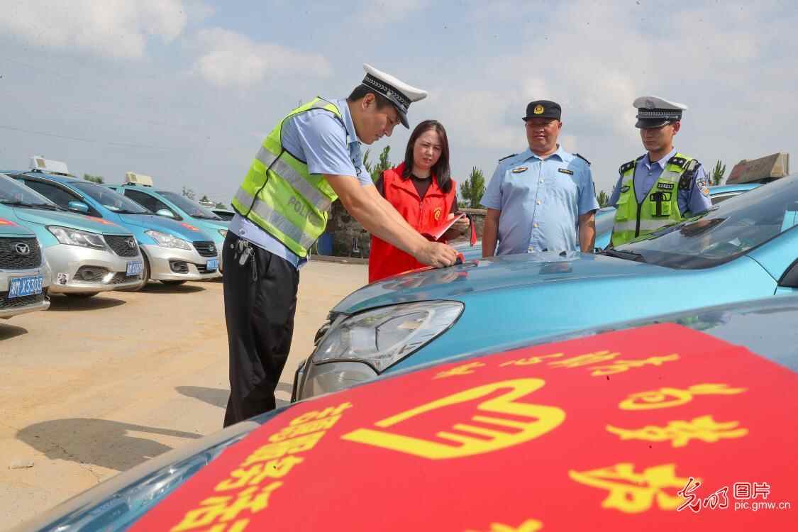 30余台出租车在经公安交警安全检查后,将在今年高考期间免费为考生提供流动、“点对点”送考服务,用爱心为新田高考学子保驾护航。(刘贵雄摄/光明图片)