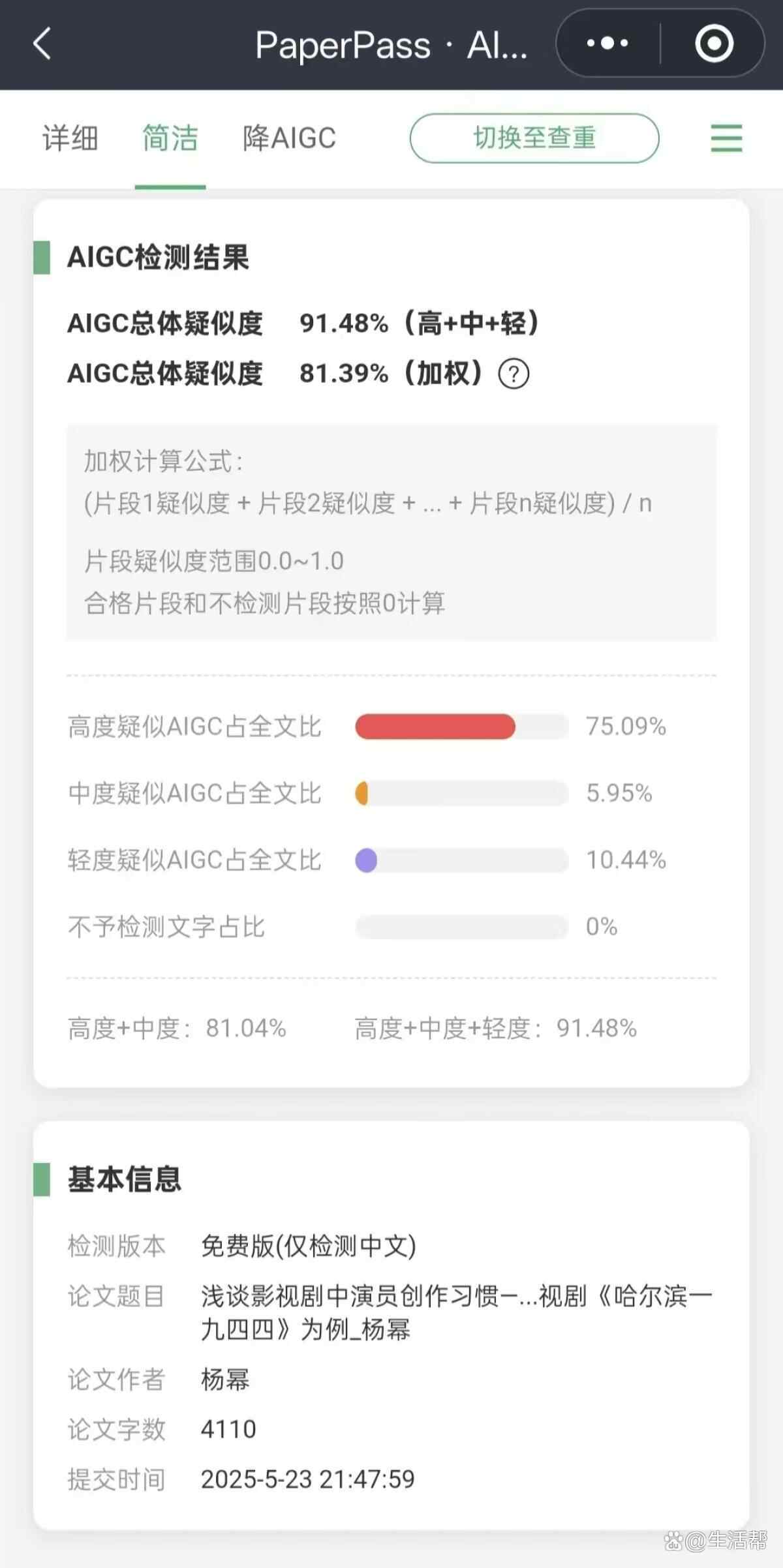然而在2025年5月23日,记者再次使用知网对该论文进行复测时,其AI率竟变为77.8%。若换用维普平台检测,结果为44.5%;而在PaperPass平台,AI率更是达到了惊人的91.48%。