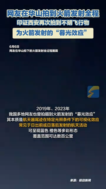 6月6日凌晨,陕西西安多位网友再次拍到不明飞行物。画面显示,该飞行物有着很长的拖尾,从地平线左侧斜着升空,大约一分钟后消失在画面当中。同时,有网友在华山拍下火箭发射全过程,印证西安不明飞行物为火箭发射“暮光效应”。
