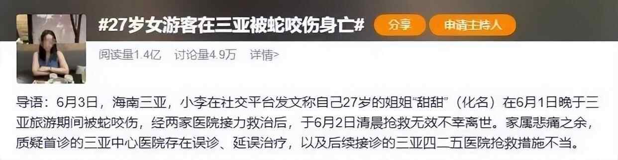 近日,一女游客在三亚疑似被蛇咬伤,自行前往医院就诊,先后经当地两家医院救治无效后死亡。相关消息引起网络热议。